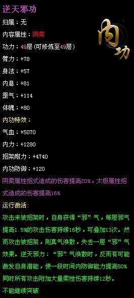 属性 阴柔 罡气 内息体魄加成 5大内功中的最高罡气,而且是唯一一个单属性上110的内功