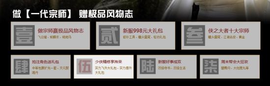 活动二,新服活动期间入驻“一代宗师”,上线即可获得998元登录大礼包1个,各种道具奖励让你快速了解武侠路;