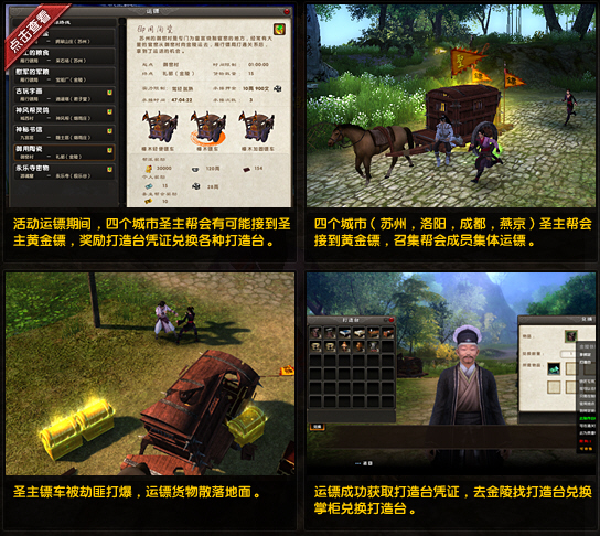 增加圣主帮会,可以接取圣主黄金镖(仅限苏州,成都,洛阳,燕京,4个主城圣主,其他圣主无法接取),单个帮会单天可接取3次圣主黄金镖