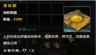描述:上好的金丝研磨成的粉末,极其珍贵,用于三、四品金装精炼之用