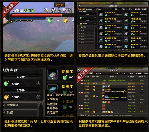 新增专家休闲点功能,玩家可以通过游戏内的一些基本行为获得对应的点数(如禁地,门派战等),通过这些点数可以在闯荡江湖界面内点数兑换界面内兑换到一些江湖武学招式、开光材料、装备、真气、修为丹等。