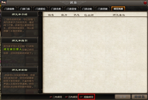 成为经脉师兄的条件:加入门派,经脉开通16个或者16个以上穴位,且经脉周天数超过360周天。成为经脉师弟的条件:加入门派,经脉开通穴位3个或以上,开通经脉低于10个。经脉师弟出师条件:穴位数10个或者10个以上。同时经脉师弟与师兄必须是同一个门派。