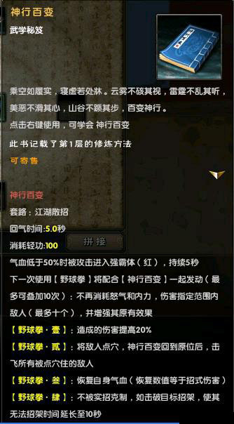 由图可以看出,神行百变是属于江湖散招,且为辅助“野球拳”的