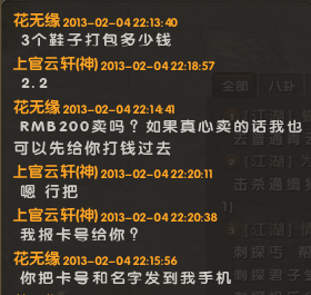 事情是这样的 今天楼主第二次开台子 人品一如既往的低劣 依然6金 合2次12金 4双金鞋子 8件金衣服...这次的6金开出来 楼主心碎了 自己留了一双 把剩下的3双鞋子 都2开 想都卖了 不至于太亏本 在门派一喊 结果一个登峰号 M我了 问我200RMB 卖不卖!3品金鞋子 苏州摊位摆720 成交价应该在600~700L不等 3双也就是2.1D 左右 现在官银售卖基本是1:12.5/13 所以 楼主以为碰见二货了 以下是聊天记录...