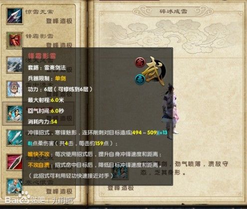 锋霜影雪 雪斋剑法核心之2,比惊雪还要重要。 超短的cd 不俗的伤害, 叠加buff后的冲锋距离和速度,使得这个技能是对付远程套路的利器。