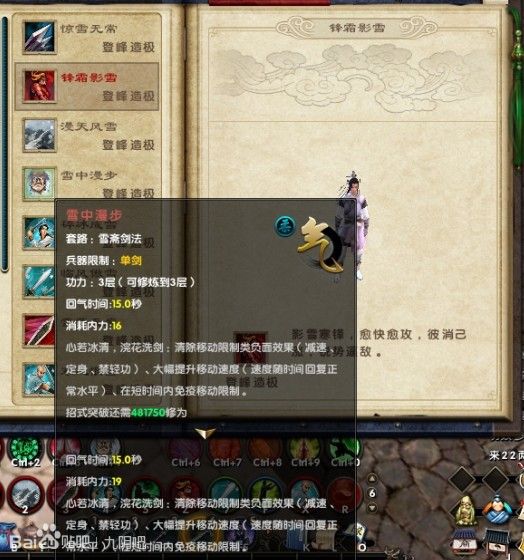 锋霜影雪 雪斋剑法核心之2,比惊雪还要重要。 超短的cd 不俗的伤害, 叠加buff后的冲锋距离和速度,使得这个技能是对付远程套路的利器。
