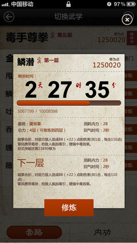 演武:消耗游戏中碎银或整银进行演武,支持开启双倍碎银功能