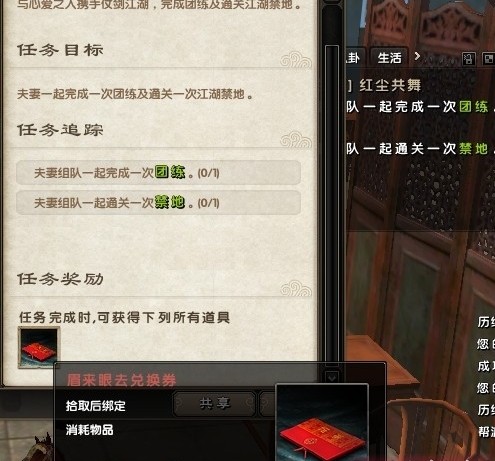 《九阴真经(新手、门派、轻功、奇遇)》武侠服4月11号更新之后,新增了夫妻每日任务,完成任务后可得到“眉来眼去兑换卷”。