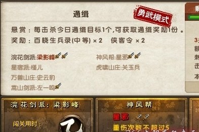 《九阴真经(新手、门派、轻功、奇遇)》武侠服“闯荡四海”新增勇武模式玩法,在勇武模式下进行踢馆可获得中等(2点)及高等(5点)百晓生兵录,且通缉奖励为普通模式的2倍。