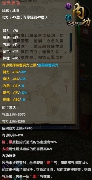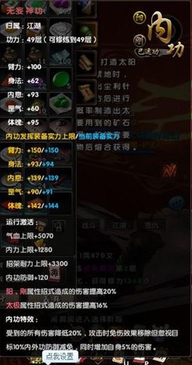 特点是招架减免伤害,臂力高,内息紧随其后,这个内功比较全能,转换身法或者罡气就几乎是全套路通用了,绝对的土豪内功。