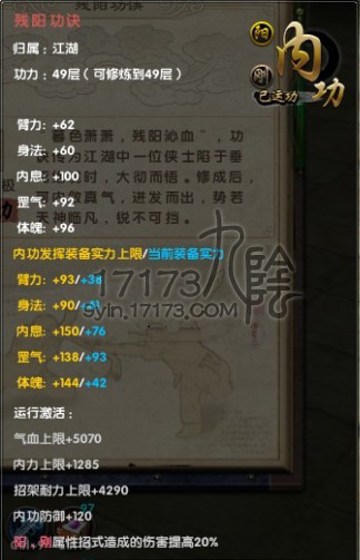 这个内功也是个纯打架的内功,我练到了49,最终属性内息-体魄-罡气各相差1点,攻击平平,亮点在于特效反击。