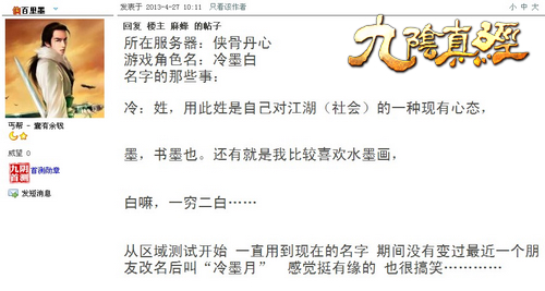 在回帖中一个玩家因崇拜金庸笔下的杨过而取名“过兒”。另一位叫“冷墨白”的玩家则分析道,冷是对江湖的一种心态,墨取自书墨也,而白则指自己一穷二白。还有一位名为“米小妮”的玩家则是因为小时候爱看米老鼠,固取此名……充满趣味的故事引来了不少玩家的参与围观,氛围其乐融融。