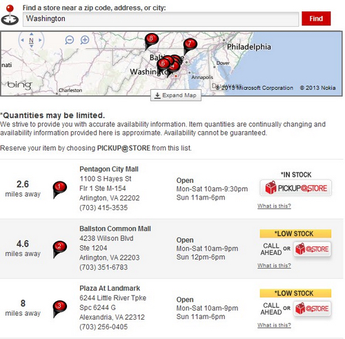 登陆GameStop官网后,玩家们可以通过查询页面来实时的查询游戏在北美各个大州的实体游戏库存情况。以华盛顿、新泽西、堪萨斯州为例,我们可以看到九阴实体版在很多店面中均呈现low stock(低库存)的状态,反映出了九阴盒装版实际销售状况非常火热。