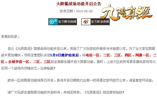 目前官方已经放出公告,在5月9日维护结束后,将电信一区、二区、三区、四区,网通一区、二区,全球华语一区、二区、三区的全部服务器开启大跨服功能。届时,上述大区内的所有玩家都将相聚于同一个战场,切磋技艺,比拼输赢。