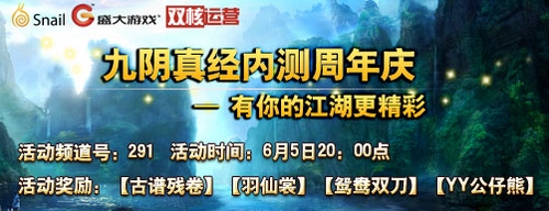 为了欢庆纪念六六内测一周年,游戏蜗牛、盛大游戏双核团队将在6月5日晚8点联合举办九阴内测周年庆YY大型线上庆典活动,届时,玩家不仅能在游戏之余放松身心,还能与九阴官方人员以及各位武林人士欢聚一堂,畅谈江湖事。