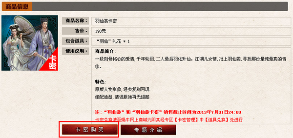 唯美柔情,重塑经典,“羽仙裳”销售活动即将进入倒计时阶段,将于2013年7月31日24:00结束,请需要购买的玩家抓住最后时机。同时,为广大玩家能够便捷购买,“羽仙裳”卡密销售模式将于7月22日16:00至7月31日24:00期间开启,欢迎玩家选择卡密模式进行购买。