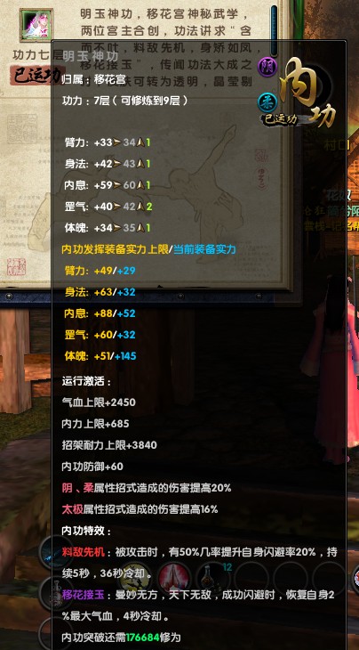 从七层明玉神功可以看出移花宫的特色了:闪避,内息,罡气可谓平分秋色,数值相差不大,而内息再内功门派中并不算高,但是却有可观的罡气加了大量的暴击与命中,也算令人满意。而明玉神功的标志性特效可谓极品,仅在一阶特效的时候便提供了20%闪避,配合闪避后回血可谓神鬼莫犯,而在实战中,这个特效会为花神七式带来大量隐藏加成。接下来,便是著名的花神七式咯!