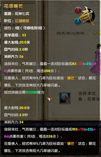 花须蝶芒,一个中规中矩的实招,10%的概率添加的蝶芒状态配合明玉神功可以轻松30%闪避,可惜触发几率偏低,打5下可能会出一次蝶芒,所以只能归为一般招式,用于补充伤害。面板伤害在一层时候便很可观,但是属性加成很低,中规中矩的技能。