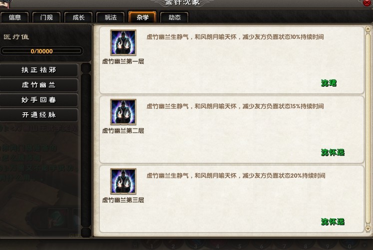 在这里只要介绍的是沈家的内功、招式和一些主要的玩法,1、首先通过内功和招式的介绍我们可以知道沈家是偏向辅助的方面也就是有点像传统网游的奶妈。