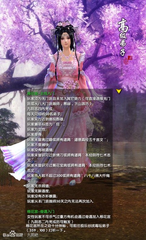 然后通过入门条件的对比可知桃花岛和移花宫一样门派也应该有黄.红.粉名加法度的问题.然后门派法度不可以跪.听说可以通过完成任务来减.就不知道桃花岛在本门派是否也要穿着门派服装.