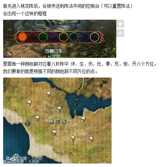 通过不同的阵眼颜色 按照系统给予的顺序都踩过才能进入.论坛有人发帖专业的3个阵的坐标 让你比较容易跑阵..加入桃花岛本们会有一个八卦GPS 让你更容易...此阵是单向的只能进不能出.