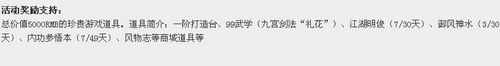 总价值5000RMB的珍贵游戏道具。道具简介:一阶打造台、99武学(九宫剑法“礼花”)、江湖明俊(7/30天)、御风神水(3/30天)、内功参悟本(7/49天)、风物志等商城道具等。