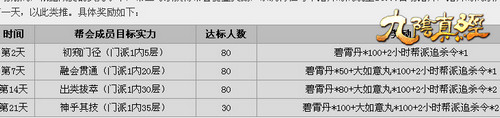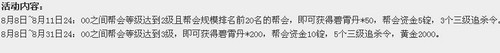 8月8日~8月31日24:00之间帮会等级达到3级,即可获得碧霄丹*200,帮会资金10锭,5个三级追杀令,黄金2000。