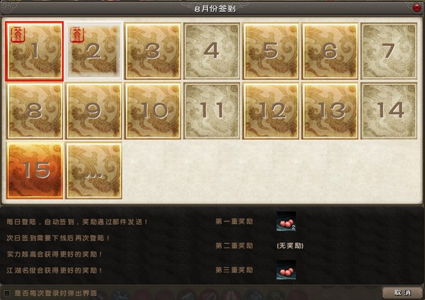 例如:"龙门客栈"服务器的玩家角色"杨过",8月9日至18日这10天都有游戏登录记录,且每天累计在线时长满40小时,则算作完成了10天的登录签到。如果该角色是江湖名俊,则已满足领奖条件,活动结束后可获得"醉拳-醉八仙"(1-3层)武学奖励一套。如果该角色不是江湖名俊,则还需在8月31日前再完成5天的登录签到,达成活动期间完成15天的游戏登录签到,则获得奖励。