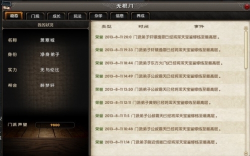 无根门的动态和其他门派的的动态没什么不同,自己的信息都有。而无根门门派声望直接影响你能兑换的权限,笔者目前日常任务大约是300/个的声望。无根门一共6个身份,对应6个兑换阶段,也就是6个无根门声望阶段。