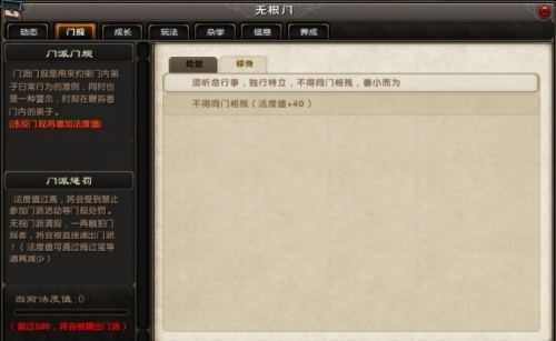 说完了门派内功技能的兑换,说下比较敏感的无根门门规。当前江湖服取消了恶标签,也没有武侠服8月7号所说的未更改标签狂涨法度。但是入门的几个顶着狂的说他们法度进来时就是70,没有涨过。所以笔者无责猜测,恶标签的法度是进门就涨。以后会改成与武侠服一样的。此外法度就2个,不得杀同门+40,不得衣冠不整+10。