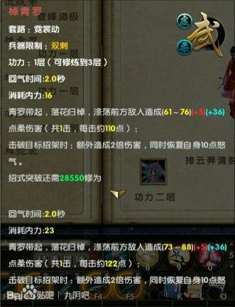 二四为肩,地盘剑阵,黄色,341点伤害,击倒效果,+20%暴击+20%命中,敌人降低20%外防(为毛不是内防。。。)持续10s,这个是九宫剑法的**技能,光看这加成就足以让人流口水了,还有九宫剑法的冲锋也是完全以此招为**技能,才能打出高伤害来,对团战的作用也不是一般的大。