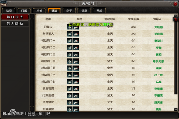 首先无根门的动态。和其他的动态一样。自己的信息都有。门派声望的多少。影响你能兑换的权限。