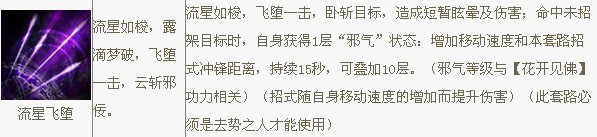 流星飞坠。飞身卧斩,一个传统武侠里“铁板桥”的动作。15米冲锋距离。造成伤害,自身获得一层“邪气”(增加自身移动速度和套路冲锋距离),并使目标眩晕一秒。一般作为辟邪的起手选择之一。
