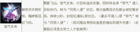 辟邪架招。招架获得“邪气”。“邪气”可以说是本套路的生命所在。辟邪剑法唯重一“快”字。不但套路出招较快,而且根据自身移动速度增加套路伤害。这招等级越高,邪气效果越好。叠加到10层时,提升效果达到最大。提升全套路威力30%左右。