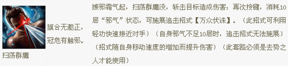 扫荡群魔,辟邪剑法第二优先的冲锋招。连斩4剑,出招速度中上。回气10S,时间很长,是此招的硬伤。