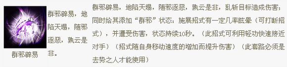 控制方面,击中之后,给对方添加“群邪”状态,在10秒内出招,可能被封招并打断招式。这个状态非常给力,类似于金玉套装的封招。会给对方带来不小的心理压力。总之,大招是辟邪为数不多的亮点之一了。