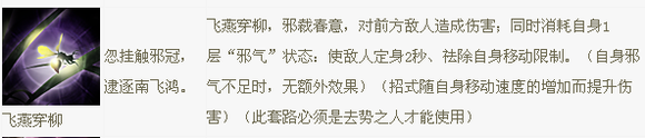 流星飞坠。飞身卧斩,一个传统武侠里“铁板桥”的动作。15米冲锋距离。造成伤害,自身获得一层“邪气”(增加自身移动速度和套路冲锋距离),并使目标眩晕一秒。一般作为辟邪的起手选择之一。