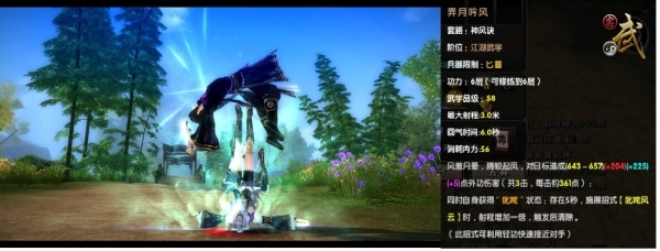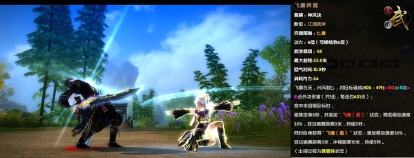 1、“飞廉”:当对手未招架,命中对手时候,给自身添加飞廉(盈)状态,移动速度提高30%,轻功施展距离3米,冲锋距离10米,持续5秒。给对手添加飞廉(虚)降低移动速度30%,屏幕显示定身,持续5秒哦。切施展控制实招“顾盼神飞”时,击中未招架目标可由原来一次击飞,上升为3次击飞,便于后续控制。