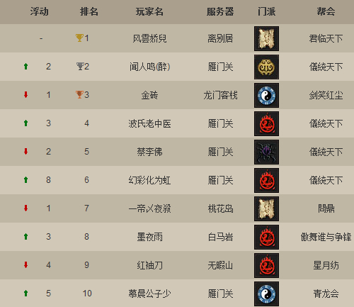 基于目前四内阶段丐帮与锦衣卫较为强势的原因,截止上周末,五大赛区前十名中,来自这两个门派的弟子可谓占据了前十中的半壁江山,十分强势。其他门派方面,武当、桃花岛、移花宫、君子堂、极乐谷、万兽山庄、金针沈家以及无门派人士均有上榜。恭喜他们!