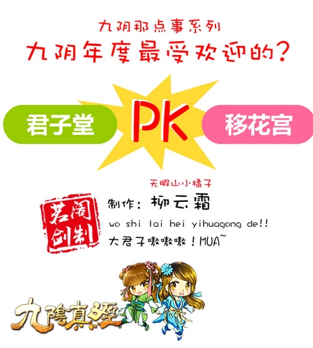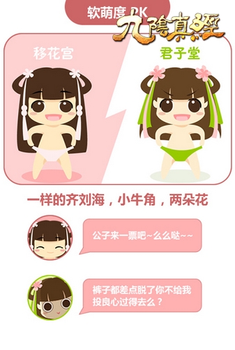 江湖传闻,君子堂与移花宫作为颇受广大女侠欢迎的门派,一直在暗暗较劲。武林谚语:有女侠的地方就有战争。今日,君子堂与移花宫的女侠聚集于此,上演一番软萌槽、健康度、武力值、文艺范、贤惠劲的大PK。由于双方美艳指数不相上下,因此更突显此番内涵大战的激烈,列位围观大侠们,两派美女巅峰对决,谁胜谁负的决定权在您们手中,请仔细围观PK,投出您神圣的一票!