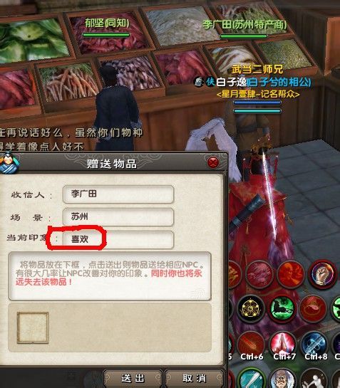 最最最重要的!就是小女孩说的特产!而且是苏州特产!有人会问,怎么着,难道在杂货铺么?不是的!完全错误,苏州特产肯定在苏州买,那么特产在哪买?答案就是在特产商那边买,在小女孩那院子出去就会找到特产商,第一个胡同就是了,找到他,点击你会发现什么选项都没,那怎么办?不用急,一样的就是刷好感啊,方法我上面讲过,就是送野怪掉落的东西。