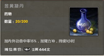 而先吃木通药散,再吃昱黄凝丹,buff是:命中率15%,臂力10,暴击率5%。