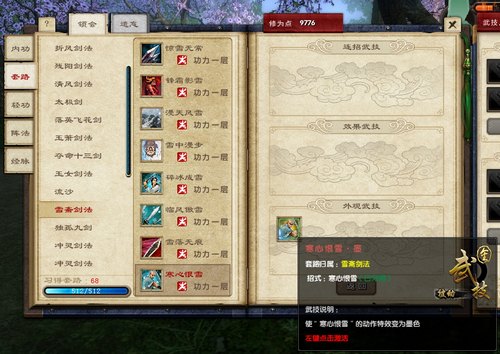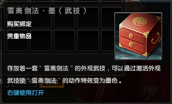 玩法开启后,大侠可至苏州城义庄周逸仙(319 732)处使用998个五蕴伏魔品兑换“雪斋剑法·墨(武技)”,使用后打开武学界面点击雪斋剑法每招旁边的“武技”按钮,激活外观武技,即可将雪斋剑法对应的招式动作特效变为水墨风格,是不是很有中国风!