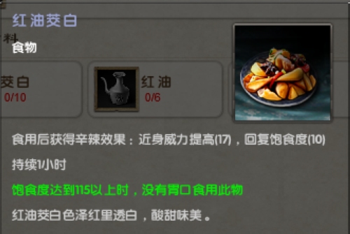 正宗的绿色健康素菜,可提高近身威力,但当饱食度达到115以上时将没有胃口食用,大侠在吃这道菜之前务必别吃太饱哦!